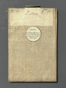 manuscrit sur étiquette, onglet de velin, pliée 20 x 13, cm. (auréole très pâle sur le segment de Lusignan ; piqûres de punaises en marges). Bel exemplaire en coloris d'époque. Etiquette du marchand parisien Vignon.