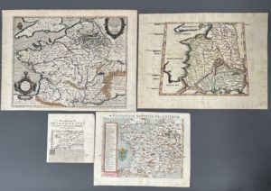 [Cartes géographique]. [France]. Ensemble de 4 cartes gravées, XVIe -XVIIe siècles. 1. [PTOLÉMÉE (Claude), FRIES (Lorenz)]. Europae tabula tertia continet Galliam [titre du texte au v°]. Carte gravée sur bois, en partie coloriée. 31 x 40 cm.,...