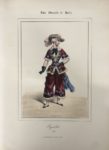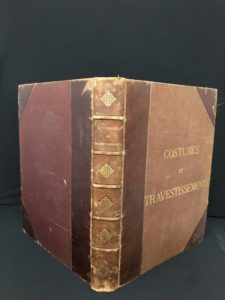 à nerfs, titre doré « Costumes et travestissement » au dos et au plat supérieur, l'ensemble monté sur onglets (dos frotté, coins émoussés). L'album réunit environ 130 planches, dont 61 à pleine page, provenant de diverses suites, « Nouveaux travestissements », « Travestissements de cette année », « Bal fashionables de l'Opéra », etc ; et 72 de format in-8 contrecollées 2 par 2 sur 36 planches, d'une série de costumes de théâtre publiée par Hautecoeur-Martinet. On trouve à la fin du volume 15 feuillets manuscrits offrant des dessins de robes et d'accesssoires à l'aquarelle et gouache et des notes sur la composition de ces costumes, dont un superbe « costume porté par la comtesse Duchâtel au bal de la duchesse Pozzo di Borgo » Provenance : Robert de Billy (1859-1963), ambassadeur, proche de Marcel Proust (ex-libris) ; Daniel Appia (ex-libris).