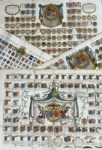 plupart sur plusieurs feuilles assemblées, coloriées (des marques de plis, souvent avec des trous aux croisements des plis, très lég. brunissures ; sauf mention contraire). Rare et important ensemble de ces superbes planches qui appartiennent à une série dessinée, gravée et publiée à Paris par Jacques Chevillard (v. 1660 - après 1724), dessinateur, graveur, éditeur, marchand d'estampes spécialisé dans les estampes héraldiques, généalogiste du roi et historiographe de France, et son fils Jacques-Louis (1680-1751). Dimensions données à la cuvette, les planches ont des marges de l'ordre de 4 cm. ou plus, presque toutes sont à toutes marges. Titres anciens manuscrits au verso. Certaines planches ont fait l'objet d'enrichissements manuscrits à l'époque. 1. Les noms, qualitez, armes et blazons de tous les chevaliers, commandeurs, et officiers de l'Ordre du St Esprit creez par le Roy Henri III... 71,5 x 100 cm. 2. Les noms, qualitez, armes et blazons de tous les chevaliers, commandeurs, et officiers de l'Ordre du St Esprit creez par le Roy Louys XIIIe... 70,5 x 99,5 cm. (lég. mouill. en marge). 3. Suitte des chevaliers de l'Ordre du St Esprit creez par le Roy Louis le Grand [chapitres 29 à 47]. 71,5 x 99,5 cm. (mouillure étendue, qq. figures tachées ou décolorées). 4. Les noms, qualitez, armes et blasons de tous les chevaliers, commandeurs de l'Ordre du St Esprit creez par le Roy Louis XVe... 72 x 100,5 cm. (pl. mouillée et usée avec lacunes dont au pli central, renforts au dos, sans marges). 5. Conseillers du Roy quartiniers de la Ville de Paris... 70 x 96 cm. Avec 4 figures d'armoiries ajoutées peintes et légendées à la main datées entre 1714 et 1720. 6. Chronologie des rois et reines de France depuis Faramond jusqu'à présent. 72 x 100,5 cm. (petite mouillure en marge). 7. Nosseigneurs les ducs-pairs de France et autres ducs vivans en 1701. 1ère carte [qui] sert de titre et de plan aux dix autres... 72 x 103 cm. (marge de tête salie et usée). Avec les armoiries de P.-J.-F. Mazarini Mancini ajoutées peintes et légendées à la main et datées 1721 8. Chronologie des anciens princes ducs et comtes pairs de France et des princesses leurs épouses. 3e carte contenant les duchez de Bourgogne, Normandie et Guyenne, les comtez de Champagne, Flandre et Toulouse. 72 x 100 cm. 9. Chronologie de nosseigneurs les princes ducs et pairs de France et des princesses leurs épouses. 4e carte contenant les duchez de Bretagne, de Bourbons, d'Orléans... 72 x 99 cm. 10. Chronologie de nosseigneurs les princes ducs et pairs de France et des princesses leurs épouses. 5e carte contenant les duchez de Valois, Nemours, Alençon, Valentinois... 73 x 100,5 cm. 11. Chronologie de nosseigneurs les princes ducs et pairs de France et des princesses leurs épouses. 6e carte contenant les duchez de Chartres, Estouteville, Estampes, Montpensier... 72,5 x 99,5 cm. (petite auréole en marge, 4 taches brunes dont 2 en marge). 12. Chronologie de nosseigneurs les princes ducs et pairs de France et des princesses et duchesses leurs épouses. 7e carte contenant les duchez de Chateauthierri, Roüanez, Penthievre... 71 x 100 cm. (petites taches). 13. Chronologie de nosseigneurs les princes ducs et pairs de France et des princesses et duchesses leurs épouses. 8e carte contenant les duchez de Beaufort, Biron, Croüy, Aiguillon... 71,5 x 100,5 cm. 14. Chronologie de nosseigneurs les princes ducs et pairs de France et des princesses et duchesses leurs épouses. 10e carte contenant les duchez de Mortemar, Créquy, Villemor, Nevers... 71,5 x 101 cm. 15. Grands ecuiers de France. [Pl. datée de 1718]. 72,5 x 51 cm. 16. Grands maistres des arbalestriers et grands maistres de l'artillerie de France. 70 x 97 cm. (mouillure claire étendue). 17. Grands aumoniers de France. [Pl. datée de 1717]. 73 x 51,5 cm. 18. Grands bouteillers ou echansons, pannetiers et queux de France. 72 x 98 cm. (brunissure le long du collage vertical). 19. Mrs les secrétaires d'Estat par département. [Pl. datée de 1722]. 70,5 x 104,5 cm. Avec les armoiries de Phelippeaux ajoutées peintes et légendées à la main datées de 1723. 20. Les noms, qualitez, armes et blasons de Mrs les secrétaires d'Estat. 70 x 46,5 cm. 21. Grand chambriers de France. [Pl. datée de 1721]. 70,5 x 98 cm. (mouillure le long d'un pli et défaut de teinte à qq. figures). 22. Les noms, qualitez, armes et blasons de de Nosseigneurs les Grands Amiraux et Généraux des Galères de France depuis le règne du Roy St Louis jusques à présent. 71 x 101,5 cm. (mouillure et taches de teinte rouge diluée sur qq. figures). 23. Les noms et armes de nos Seigneurs du Conseil d'Estat. 95 x 62 cm. (marge de tête usée et salie, fente à un pli au centre). Avec 4 figures d'armoiries ajoutées peintes et légendées à la main datées 1716 et 1717. 24. Portes oriflam[m]e de France. 69,5 x 46,5 cm. 25. Grands Maistres de France. 71 x 48 cm. 26. Les noms, qualitez, armes et blasons de Nosseigneurs de la Cour du Parlement de Paris en l'année 1693. 62 x 95 cm. 27. Suitte du Parlement de Paris depuis le 23e janvier 1709. 72,5 x 50,5 cm. Avec de nombreuses armoiries ajoutées peintes et légendées à la main datées entre 1716 et 1720. 28. Les noms, qualitez, armes et blasons de Nosseigneurs de la Cour des Monoies comme elle étoit en 1694, avec les additions jusqu'à présent. 71,5 x 49 cm. 29. Les noms, qualitez, armes et blasons de Nosseigneurs de la Cour des Monnoies comme elle est à présent au mois de décembre 1715. 72,5 x 50 cm. (tache brune au centre). 30. Prevosts des marchands echevins procureurs du Roy greffiers et receveurs de la Ville de Paris... depuis l'an 1268... fait et recherché par le Sr Chevillard... en 1703... 71,5 x 97,5 cm. 31. Suitte des prevosts des marchands echevins procureurs du Roy greffiers et receveurs de la Ville de Paris. 71 x 98 cm. Avec plusieurs armoiries ajoutées peintes et légendées à la main datées entre 1717 et 1720. 