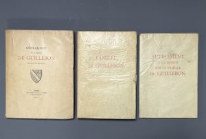été tiré à 450 ex. num., celui-ci sur vergé non justifié. Textes imprimés en rouge et noir. Enrichi d'une carte de visite de Gabriel de Guillebon. On joint : - GÉNÉALOGIE de la maison de Guillebon originaire du Beauvaisis. Amiens, Impr. Piteux, 1893. In-4, nombreuses armoires reproduites dans le texte ainsi que quelques vignette, broché. Tiré à 300 exemplaires, celui-ci ne comporte pas de feuillet de justification mais une mention manuscrite : « n° 230 offert par Edouard de Guillebon ». (Saffroy 42482). Soit 3 volumes.