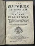 [Reliure aux armes]. BELLEFONDS (Laurence Gigault de). Les Oeuvres spirituelles de Madame de Bellefont,... A Paris, en la boutique d'Elie Josset, chez G. Cavelier fils, 1712. In-8, [22] f., 614 p., [5] f., 24 p. (stances), veau brun époque, dos à 5...