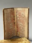 dorée, tranches dorées, doublure et de papier gaufré et doré (dérelié, coins émoussés, tache d'encre sur gardes inf.). On joint : Couverture (de carnet ?) du XVIIIe siècle en maroquin havane, in-24, plats décorés à la plaque avec figure de femme au centre surmontant la mention « Babet que t'est gentille », doublure de satin brodé, signet de satin (usure au dos). Soit 2 volumes.
