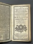 [Almanach]. CALENDRIER (LE) DE LA COUR, tiré des ephemerides... pour l'année mil sept cent cinquante cinq... A Paris, de l'Impr. de J.-J.-E. Collombat, 1755. In-24, maroquin lavallière époque, plats décorés en bordure d'une plaque florale...