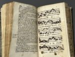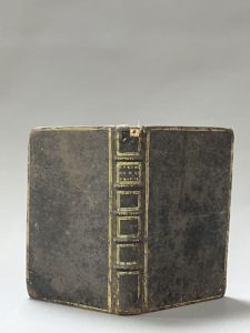 époque, dos à 5 nerfs, titre doré, caissons et plats bordés d'un double filet doré, tranches dorées sur marbrure (rel. frottée, défauts dont coiffe de tête arrachée, 2 coins usés ; taches de cire sur qq. p., un feuillet (colophon ?) semble manquer à la fin après la table). Unique édition, très peu commune : le CCFr ne localise que 4 exemplaires (2 à Compiègne, 1 à Amiens, 1 à Chantilly privé de page de titre). Quelques annotations anciennes soignées en marge et des des pièces collées, qq. lignes masquées ; 3 pages de musiques manuscrites insérées.
