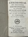 [Ordres religieux]. CEREMONIAL DES RELIGIEUSES chanoinesses de l'ordre de Saint Augustin, du prieuré Hostel-Dieu de Saint Nicolas de Compiègne. A Soisson, chez C. Courtois, 1727. In-8, 342 p., [1 (sur 2 ?)] f. (table), musique notée, maroquin noir...