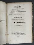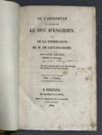 de Mgr le duc d'Enghien et de la justification de M. de Caulaincourt. Troisième éd. corrigée zte augmentée. A Orléans, et se trouve à Paris, chezles marchands de nouveauté, 1814. 50 p. - 2. [SAVARY]. Extrait des mémoires de M. le duc de Rovigo concernant la catastrophe de M. le duc d'Enghien. A Paris, chez Gosselin, Ponthieu, 1823. [2] f., 68 p. (les 2 dernières en 2 versions). 3. MEHEE DE LA TOUCHE. Extraits des mémoires inédits sur la Révolution française. 2e éd. Paris, Plancher, 1823. 95 p. - 4. HULIN. Explications offertes aux hommes impartiaux,... au sujet de la commission militaire instituée en l'an XII pour juger le duc d'Enghien. Deuxième édition. Paris, Baudouin, 1823. [2] f., 15 p. - 5. [DUPIN]. Pièces judiciaires et historiques relatives au procès du duc d'Enghien, avec le Journal de ce prince depuis l'instant de son arrestation... Paris, Baudouin, 1823. [2] f., 40-XXXII p. - 6. MAQUART. Réfutation de l'écrit de M. le duc de Rovigo, avec pièces justificatives et des observations sur les explications de M. le comte Hullin ; suivie de l'éloge de Mgr le duc d'Enghien,... par M. Maquart. Paris, Delaunay, 1823. X-152 p. (rousseurs). Enrichi de 21 feuillets manucrits de l'époque offrant des extraits du Journal des Débats.