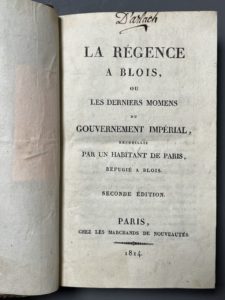 Régence à Blois, ou Les derniers momens du gouvernement impérial, recueillis par un habitant de Paris, réfugié à Blois. Seconde édition. Paris, chez les Marchands de nouveautés, 1814. 88 p. - 2. Itinéraire de Buonaparte, de l'île d'Elbe à l'île Sainte-Hélène, ou Mémoires pour servir à l'histoire des événemens de 1815, avec le recueil des principales pièces officielles de cette époque... Paris, Le Normant, 1816. [1] f., VI-254-214 p. Provenance : D'Arlach (sign. au titre).