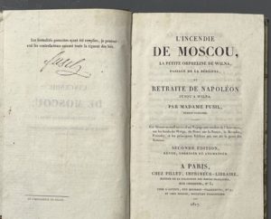 FUSIL (Louise). L'incendie de Moscou, la petite orpheline de Wilna, passage de la Bérésina et retraite de Napoléon jusqu'à Wilna. Par madame Fusil, témoin oculaire... A Paris, chez Pillet, 1817. In-8, [5] f., V-102 p., [1] f. (catalogue),...