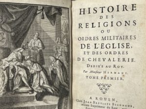 [Reliure aux armes]. HERMANT (Jean). Histoire des religions ou ordres militaires de l'Église et des ordres de chevalerie. A Rouen, chez J. B. Besongne, 1725. Deux volumes in-8, veau fauve époque, dos à 5 nerfs, pièces de titre et de tomaison...