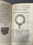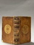 maroquin, caissons ornés en maroquin de teintes variées, double filet doré aux plats, armes dorés, roulette dorée aux coupes, tranches rouges (défauts dont trav. de vers au bord d'un plat et en queue des mors, déch. sans mq. p.131 t.1). L'illustration se compose de nombreuses figures gravées sur bois dans le texte, et d'un frontispice gravé sur cuivre d'après Humblot. Provenance : aux armes de Paulin Prondre de Guermantes (1650-1723), receveur général des finances à Lyon puis président en la Chambre des Comptes de Paris (OHR 1951 fer 1) ; général Mathieu Dumas (1759-1837, ex-libris) ; Henri Chasles (1795-1868), député d'Eure-et-Loir, maire de Chartes (ex-libris) ; C.-V.-E. Boyer de Sainte-Suzanne (1824-1884), baron d'Empire, gouverneur de Monaco (ex-libris).