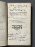 [Reliure aux armes]. MONCHABLON (E.J.). Dictionnaire abrégé d'antiquités... A Paris, chez Desaint & Saillant, 1761. In-12, basane havane mouchetée époque, dos à 5 nerfs, pièce de titre maroquin grenat, caissons ornés, armes dorées aux plats,...