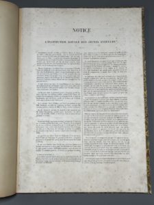 rousseurs, accrocs en marge d'une pl.) Notice architecturale sur l'édifice situé au 32 du Boulevard des Invalides à Paris, nouvel établissement de l'institution fondée par Valentin Haüy. Elle se compose de 3 pages de texte et de 6 planches gravées sur acier par Hibou d'après les plans et élévations dessinés par l'auteur, F. Philippon, architecte. Très probablement extraite d'un recueil sur l'architecture (pl. num. de 339 à 344), on la trouve rarement isolée (au CCFr un seul. ex. à la Médiathèque de l'Architecture de Charenton-le-Pont, aucun à la BnF).