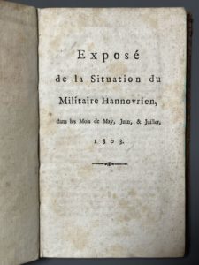 [WALLMODEN-GIMBORN (Ludwig von)]. Exposé de la situation du militaire hannovrien, dans les mois de may, juin & juillet 1803. S.l., s.n., [1804 ?]. Deux parties en un volume in-8, 102 p., [1] f. (errata), 96 p. basane fauve racinée époque, dos à...