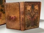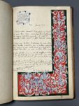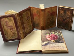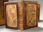 renferme des envois poétiques à l'intention de la destinatrice, certains enrichis de jolis dessins à l'aquarelle. La dernière mention datée est de 1955. La première page est une œuvre de Paul Chatry, rose dans un pichet, accompagnée d'un poème autographe signé et datée du 29 avril 1928. On joint 3 ouvrages revêtus de reliures originale d'amateur, à décor en cuir repoussé et teinté, en vogue au début du XXe siècle : - CONSTANT (B.). Adolphe. Illustrations en couleurs par Serge de Solomko. P., Ferroud, 1913. In-12, ex. num. sur vélin teinté d'Arches, tête dorée, non rogné - Le Béranger des familles... P., Garnier, [vers 1910]. In-12, figures, rousseurs. - ROCHARD. Jésus selon les Evangiles. P., Lemerre, 1913. In-12, tête dorée, non rogné.