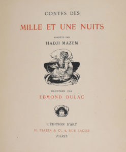 DULAC. CONTES DES MILLE ET UNE NUITS. Adaptés par Hadji-Mazem. Illustrés par Edmond Dulac. Paris, Piazza, [1907]. In-4, broché (dos décollé, marges jaunies). Ouvrage illustré de 50 planches en couleurs contrecollées, sous serpentes...