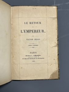 HUGO (Victor). Le retour de l'Empereur. Paris, Delloye, 1840. In-8, 30 p., [1] f. blanc, demi-cuir de Russie à la Bradel vert bronze postérieur, pièce de titre rouge en long, aigles en fleurons, couverture conservée (un coin restauré), non...