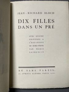 LAURENCIN. BLOCH (Jean-Richard). Dix filles dans un ré. Paris, Au Sans Pareil, 1926. In-12, broché (dos insolé). Edition originale illustrée de 4 gravures à l'eau-forte par Marie Laurencin. Tirage limité à 995 exemplaires : un des 800 sur...