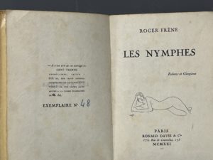 MODIGLIANI. FRÈNE (Roger). Les nymphes. Paris, Ronald Davis & Cie, 1921. In-12, broché (couv. et dos très lég. insolés, qq. rousseurs). Edition originale, illustrée de 5 compositions du peintre Amedeo Modigliani (1884-1920), 4 à pleine page et...