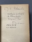 Blanche qui a fait le tour du monde des peintres et des lettres, restant jeune comme les vrais pélerins passionnés... ». - Hiver caraïbe. Documentaire. Paris, Flammarion, 1929. In-12, demi-percaline similaire. Carte de visite de l'auteur. - France la doulce. P., Gallimard, 1934. - L'homme pressé. P., Gallimard, 1941. - Feu M. le duc. Genève, Milieu du Monde, 1942. 3 volumes in-12, reliures récentes identiques demi-chagrin orangé à coins, dos à 5 nerfs, auteur et titre dorés, tête dorée, couv. conservées. Edition originales, exemplaires du service de presse, chacun avec envoi. Provenance : Jacques-Émile Blanche (1861-1942), peintre et écrivain, par descendance. Soit 5 volumes.