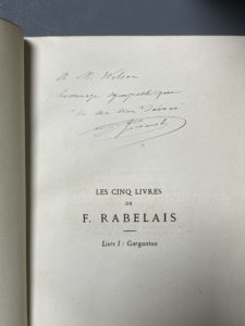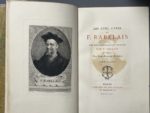 olive, dos à 4 nerfs saillants, titre, tomaison, lieu et date dorés, caissons ornés, double filet doré aux plats, tête dorée, couv. et dos conservés, non rogné [J. Weckesser] (dos passés uniformément fauve, des coins et une coiffe un peu frottés ; transferts des figures). Edition illustrée d'un portrait de Rabelais et de 10 eaux-fortes. Tirage en grand papier limité à 200 exemplaires : un des 170 sur Hollande (n° 90). Ex-dono autographe signé de l'éditeur Jouaust à M. Wilson.