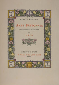 WÈLY. MAUCLAIR (Camille). Âmes bretonnes. Trois contes illusrés par J. Wély. Paris, L'Edition d'Art H. Piazza, 1907. In-8, broché, étui éditeur titré or (dos de l'étui passé). Ouvrage illustré de 50 compositions en couleurs dans le texte...