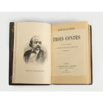 doublures et gardes de moire bordeaux, doubles gardes de papier marbré, couv. et dos cons., tête dorée, non rogné (Ch. Septier). Édition originale, illustrée d'un portrait de l'auteur en frontispice. C’est la dernière œuvre de Flaubert publiée en librairie de son vivant. Ces trois contes remontent le temps : "Un cœur simple" se passe au XIXe siècle, "La Légende de Saint-Julien l'Hospitalier"au Moyen Âge, et "Hérodias" dans l’Antiquité. Un des 100 exemplaires sur hollande, n° 53, très bien établi par Charles Septier. Trace d'insolation sur le titre.