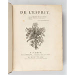 HELVÉTIUS (Claude Adrien)]. De l’esprit. Paris, Durand, 1758. In-4, faux-titre, titre, xxii pp., 643 pp. ; veau marbré, doslisse orné, tr. rouges (Rel. ép.). Edition originale de second tirage et le premier mis dans le commerce...