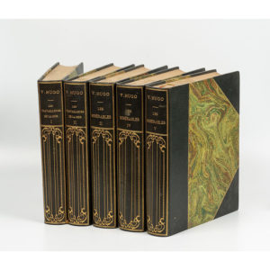 édition, dont la parution débuta l'année même de la mort du poète. Ces Œuvres complètes de Hugo sont classées en 7 catégories : Poésie, Drame, Roman, Histoire, Philosophie, Actes et paroles et Voyages. Elles n’incluent pas les œuvres posthumes, telles les Correspondances. Elle est illustrée de portraits de Victor Hugo, et de très nombreuses planches et vignettes d'après les plus grands artistes de l'époque, dont Luc-Olivier Merson, Félix Bracquemond, Léopold Flameng, Pierre-Georges Jeanniot, Auguste Rodin, Georges Antoine Rochegrosse, Jean-Paul Laurens, Gervex, G. Boulanger, Carrier Belleuse, Dalou, Gérôme, Rodin, Henner, Fantin-Latour, etc. Quelques piqûres et taches. Rares trous de vers, dos légèrement passés et frottés, petits accrocs, de rares mors fendillés.