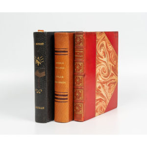 chez le même éditeur : - BENOÎT (Pierre). Axelle. 1932. In-8, demi-maroquin bleu à coins, dos lisse orné d'une composition dorée et mosaïquée, tête dorée, couv. et dos cons. (Flammarion). Illustrations de Lucien Boucher en couleurs. - RÉGNIER (Henri de). L'Escapade. 1931. In-8, demi-basane orange à coins, dos à nerfs orné, tête dorée, couv. cons. sans le dos (Flammarion). Illustrations de George Barbier. Ex-libris Tavernier collé a posteriori. Dos passé, frotté, reliure tachée.