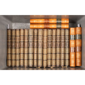 Édition originale, avec une planche et un fac-similé in fine. - THIERS. Histoire de la Révolution française. Paris, Furne, Jouvet et Cie, s.d. 2 vol. Ill. par Yan' Dargent. — Histoire du Consulat. Paris, Lheureux et Cie, 1865. Illustrations. — Histoire de l'Empire. Paris, Lheureux et Cie, 1865. 4 vol. 280 dessins. — Ens. 7 vol. in-4, demi-mar. fauve, dos à nerfs, pièces de titre vert et brun. - MICHELET. Histoire de la Révolution française. 6 vol. — Histoire de France. 8 vol. Paris, Jules Rouff et Cie, s.d. — Ens. 14 vol. in-4, demi- mar. brun, dos orné. Illustrations. - HOUSSAYE (Arsène). Notre-Dame de Thermidor. Histoire de Madame Tallien. Paris, Plon, 1866. In-8, demi-chagrin rouge. - HOUSSAYE (Arsène). 1815. Paris, Perrin, 1912. 4 vol. in-12, demi-veau teinté, dos à nerfs orné (Flammarion-Vaillant). - THIERRY (Augustin). Histoire de la conquête de l'Angleterre par les Normands. Paris, Furne, 1859. 5 vol. in-8, demi-chagrin brun, monogramme E. D. en pied. Nouvelle édition. - LA GOURNERIE (Eugène de). Histoire de Paris et de ses monuments. Tours, Mame, 1854. In-8, demi-chagrin brun ép. En l'état.