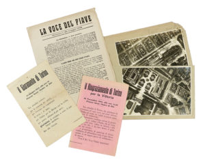 Album cartonato con 107 fotografie in b/n (alcune virate a sepia) relative alla Prima Guerra Mondiale scattate nei teatri bellici in Italia, Macedonia e Albania. Minute didascalie a penna nera sui margini di molte foto. Album telato oblungo, coevo, con usure ai bordi; fotografie in stato più che buono. Dimensione album: 480x340 mm; foto in formati vari da 285x230 a 120x80 mm. (1) Le fotografie ritraggono, tra le altre, nell'ordine dell'album: re Vittorio Emanuele III ed il presidente francese Poincaré alla premiazione di un soldato a Purgessimo (UD); Diaz, Badoglio e il gen. Scipioni; Cesare Battisti in divisa da alpino; il duca di Connaught al fronte; il ponte di Varza (sic.) distrutto; una missione neutrale al fronte; cannoni autotrasportati; truppe inglesi; un piccolo cimitero militare sull'altopiano di Asiago; ricerche di feriti; l'avanzata dell'agosto 1917; truppe francesi; trincee ed accampamenti; camion militari in deposito; il conte di Torino; la parete rocciosa della valle Lagarina (formata da 3 foto); Grado; il pittore Sertorio al lavoro con altri; la marcia vesso il monte Tomba; un bombardiere biplano Caproni a tre timoni; feriti e caduti; Gorizia e prigionieri dopo la presa della città; un convento distrutto a Monte Santo; il cimitero di Gorizia bombardato; truppe in Macedonia; la Banca Imperiale Ottomana di Salonicco; la baia di Santi Quaranta (Sarande – Albania); un'avanzata di fanteria a S.ta Caterina Valfurva; trinceee a Monfalcone; un tank in azione sul Carso; il teatro Verdi a Fiume; truppe a Monte Cucco (Kuk); caduti al monte Ermada; postazioni trincerate sul Carso; un bombardamento di Montello; traino di cannoni sulla Bainsizza; Pola; truppe sul Montello; un biplano austrico abbattuto verso il Piave; caduti nel Piave; un bombardamento a Guiris (sic.) alla (tristemente nota) quota 1050, in Macedonia; Argiocastro, Gianina e Valona in Albania (panoramiche); un ponte italiano sulla Cerna (Macedonia); Salonicco; scene di folklore nell'Africa Orientale Italiana. Nell'album sono conservate staccate anche: n.2 foto aeree di Vienna scattate dal Ten. Locatelli durante il Volo su Vienna del 1918 - n.22 piccoli volantini originali oblunghi, patriottici e irredentisti inneggianti alla Patria, al Duce, a Trento e Trieste, all'Armir, ai reduci del fronte russo, alla visita del presidente Loubet in Italia, alla Francia contro la Triplice, oppure contenenti frasi di Carducci (per l'inaugurazione del monumento a Dante a Trento e contro la condanna di Oberdan) - n.5 stampati originali: due Ringraziamenti e Giuramenti di Torino del 1918 - due estratti dai giornali di guerra Il Razzo e La voce del Piave - un dépliant sull'impiego della maschera antigas Draeger ('15-'18) - un radiomessaggio per la festa dell'Artiglieria del 1946.