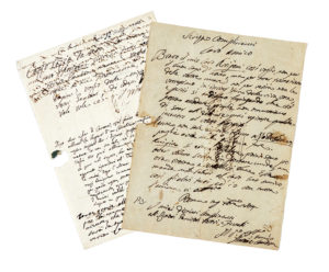 Manoscritti a inchiostro bruno, 2 carte scritte recto e verso. Carte con piegature a busta e nome del destinatario al verso. In una lettera, non datata, è presente la mano di Canova e quella di altre tre mani (una è di Antonio d'Este). Piccoli strappi in corrispondenza dei sigilli in ceralacca (non più presenti), e tracce di inchiostro del verso passate al recto, ma condizioni più che buone. Dimensioni varie. (2) Lettera non datata: Cazzo, cazzo da vero! Come mai il caro Arrigoni scrive a tutti ed al povero Canova niente? Voglio due righe a me direttamente, avete capito? Voglio delle notizie de' vostri Servitori e di codesti Paesi. Vale vale ecc. Il vostro amico vero Canova. Lettera datata dicembre 1804: Senza complimenti caro amico Bravo il mio caro Arrigoni così voglio, non per il buon caso dell'anno, ma per aver tanto tanto delle vostre nuove noi per verità non le vorressimo per iscritto meno della viva voce, e perciò si andiamo lusingando che ciò possa accadere [...]. Nella lettera è nominato Luigino (probabilmente lo scultore Luigi Zandomeneghi).