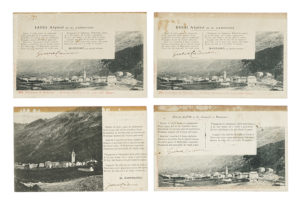 Firme autografe a penna nera apposte al recto di 4 cartoline postali illustrate in b/n, stampate da Giovanni Ogna, tipografo ed editore in Chiavenna. Ogni cartolina riporta al recto la firma autografa di Carducci, accanto a belle immagini panoramiche della Madesimo di inizio '900 e rime a stampa, afferenti alla nota località, tratte dagli Idilli Alpini del poeta. Al verso, affrancature e annulli postali datati Madesimo 26.8.1901 (l'8 è leggibile solo su alcuni timbri). Segni di antica carta gommata ai margini superiori. Dimensioni: 140x90 mm. (4) Carducci amava Madesimo, dove per molti anni aveva trascorso le vacanze estive; il 14 luglio del 1901 il poeta, ormai anziano e famosissimo, ricevette la cittadinanza onoraria da parte del Consiglio Comunale. Per l'occasione fu fatta stampare da Giovanni Ogna una serie di cartoline ricordo. Evidentemente il 26 luglio 1901 Carducci si prestò ad autografare alcune di esse. Una curiosa rarità.