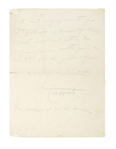 Manoscritto a matita nera. 1 bifolio, scritte 2 pagine. Piccoli difetti ai margini. Dimensioni 155x205 mm. (1) [...] avrei voluto risponderle da tanti giorni ... ma le parrà incredibile son sempre stato male. A Milano dovetti rimanere in letto tre giorni dopo la sera passata in casa sua e ora sono a letto da una settimana con una febbre ostinata e stupida. Ma lei vorrà accettare [...] in ritardo questo mio ringraziamento per la sua affettuosa e buona ospitalità e vorrà essere così cortese da porgere per me molte grazie e saluti alla sua gentile signora. Con tanta cordialità suo Casorati. Una carezza al suo bel bambino.