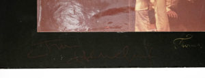 Hendrix Jimi, Fotografia a colori con firma autografa di Jimi Hendrix e del fotografo Thomas Dellert su passe-partout. Non datata, ma 1969.