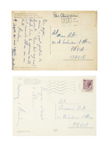 Manoscritti a inchiostro blu. Una cartolina è mancante del francobollo. Sulla cartolina che raffigura il Cervino l'attrice scrive: E' il posto dei miei sogni. Baci Audrey. Dimensioni: 148x105 mm. SI AGGIUNGONO: 3 cartoline di Maria Luisa Dotti (Mimise), moglie di Renato Guttuso. Anni '60. (5)