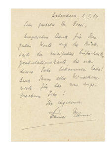 Mann Thomas, Cartolina postale autografa firmata inviata ad un amico italiano. Datata primo gennaio 1954.