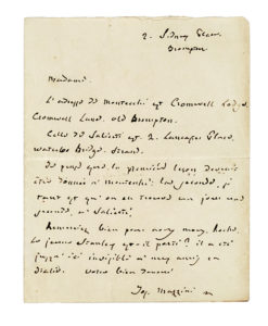Manoscritto a inchiostro nero. 1 bifolio, scritta 1 pagina. Testo in francese. Piccolo taglio al bordo della piegatura, che non interessa il testo. Dimensioni 90x115 mm. (1) La lettera è scritta da 2. Sidney (Sydney) Place Brompton. Madame. L'adresse de Montecchi est Cromwell Lodge, Cromwell Land. Old Brompton. Celle de Saliceti est 2. Lancaster Place. Waterloo Bridge. Strand. Je pense que la première leçon devrait être donnée à Montecchi, la seconde, si tant est qu'on en trouve un jour une seconde, à Saliceti. Remerciez bien pour nous Mary Roche. Le jeune Stanley est-il parti ? Il a été jusqu'ici invisible à mes amis en Italie. Votre bien devoué Jos. Mazzini. La residenza di Sydney Place a Brompton (oggi nel quartiere di Kensington And Chelsea) è una delle tante nelle quali visse Mazzini durante il suo lungo esilio londinese. Mattia Montecchi e Aurelio Saliceti sono due illustri patrioti che collaborarono con l'amico Mazzini. Come si evince dalla lettera, essi collaborarono come insegnanti nella Scuola creata da Mazzini per i figli degli emigrati italiani indigenti. Questa iniziativa ebbe anche il sostegno di Charles Dickens.