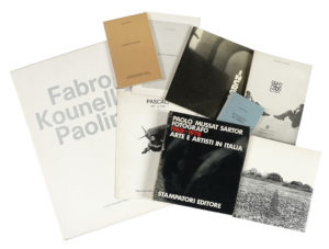 Compongono il lotto: 1) Pascali Pino, 1965 - Le Armi. Torino: Franz Paludetto, 1984; 2) Fabro Luciano, Lectures parallèles II. Genève: Adelina Cüberyan, 1974; 3) Germano Celant, Arte Povera. Milano, Mazzotta Editore, 1969; 4) Boetti Alighiero, Dall'Oggi al Domani. Brescia, Edizioni L'Obliquo / Galleria Massimo Minini, 1988 [i.e. 1991?]. Elenco completo disponibile su richiesta. (9) I OPERA: Catalogo monografico, estremamente raro e ricercato, di Pino Pascali dedicato alla serie Le Armi, uno dei nuclei più emblematici della ricerca dell'Artista, e relativo alla mostra tenutasi presso la Galleria Franz Paludetto di Torino nel 1984. Il volume documenta installazioni e sculture realizzate con materiali industriali e di recupero, presentato attraverso un apparato fotografico in bianco e nero di forte impatto visivo, accompagnato da testi critici e da una sezione biografica. III OPERA: Volume fondamentale, pubblicato nel 1969, che segna l'affermazione teorica del movimento Arte Povera e che raccoglie i testi critici di Germano Celant e documentazione fotografica, opere e interventi di Boetti, Kounellis, Paolini, Pascali, Penone, Pistoletto e molti altri protagonisti dell'avanguardia italiana.