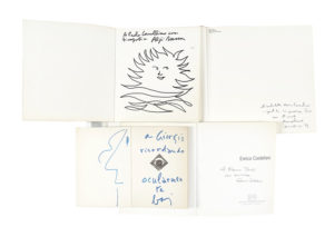 Compongono il lotto: 1) Baj Enrico, Apocalisse. A cura di Umberto Eco. Milano: Mazzotta, 1979. Dedica autografa e disegno dell'Artista al contropiatto anteriore e all'occhietto. 2) Sassu. Milano: Electa, 1984. Dedica autografa e disegno dell'Artista all'occhietto. 3) Enrico Castellani, Opere 1959/1977. Bergamo: Fumagalli, 1997. Con dedica autografa dell'Artista al frontespizio. 4) Bonalumi. Introduzione di Gillo Dorfles. Milano, Edizioni del Naviglio, 1973. Con dedica autografa dell'Artista datata 1974. (4) III OPERA: Ricco catalogo della mostra svoltasi alla Galleria Fumagalli di Bergamo nel marzo-aprile 1997. IV OPERA: Edizione originale. Progetto grafico di A.G. Fronzoni e fotografie di Giacomelli, Mulas e altri.