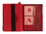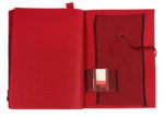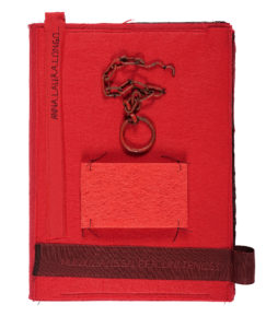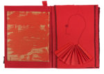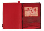 In-folio (mm 400x300). Carte [3]. Libro d'artista polimaterico in tecnica mista, con pagine in feltro e applicazioni in: lana, lino, cotone, spugna di spessore medio-alto, ritagli in gros grain (canneté), ventaglio manipolato, catenella in ferro ossidato e soggetta a verniciatura sommaria, gel esfoliante modificato con colore per tessuti e fissato con collage, organza con trama operata, ciocche sintetiche, cartella anni '80 con elastico soggetto a tensione media e con fissaggio in filo cerato annodato, inserto con paillettes e carta con disegno collocato in un riquadro in plastica da listini, ritagli ricavati da stivali in pelle di vernice lucida, banda di tela adesiva, fili diversificati per traiettorie poetiche e per sagome parzialmente in rilievo. Legatura in feltro con inserti in lino, spugna e catenella in ferro ossidato parzialmente verniciata al piatto anteriore e titoli ricamati. Il piatto anteriore è rinforzato internamente da un cartone decorato a mano, che conferisce volume e ispessisce il corpo stesso del libro. Opera unica, firmata dall'Artista al piatto posteriore su una specifica banda in tessuto di lino. Il tutto perfettamente conservato entro custodia originale in tessuto rosso. (1) Dalle parole dell'Artista: «Nuovo Rosso per un'ipnosi è un'opera strettamente connessa con Oblungo Rosso - Con incorporazione di tela, risalente al 2024. Un anno di distanza separa quindi i due lavori, che alimentano la produzione più recente attraverso indagini polimateriche specifiche, ruotanti intorno ad aspetti tipicamente monocromatici. Quella che viene ad essere ipotizzata è una sorta di "mono-coltura" dal punto di vista del trattamento del colore, essendo la ricerca legata a una vera e propria "progettazione territoriale" riguardante le pagine stesse, impostate sulla base di volumetrie e accentuate scoperte sensoriali oltreché percettive. Siamo dunque in presenza di pagine-territori, per una fruizione ad ampio raggio. Prosegue infatti, anche in questo caso, la ricerca meticolosa sui materiali che appaiono particolarmente versatili e inattesi, rivelando un interesse precipuo per la variabilità delle consistenze e per la molteplicità della resa materica, anche in termini di possibili associazioni in vista di una costruzione di un apposito mélange. Trattasi propriamente di un mélange di proposte visive e tattili. L'insistenza sulle gradazioni del rosso ipotizza una sorta di avventura ipnotica. Il rosso - strutturalmente connotante - viene quasi ad essere irradiato assumendo dei risvolti inebrianti. Compaiono nelle pagine centrali alcune parziali velature, ottenute grazie alla presenza di organza operata, che si sovrappone a scritture e tracce di tipo evocativo- pittorico. Da questo punto di vista si evidenzia un rimando alle pratiche di nascondimento precedentemente attuate in VolumetricOscuro. Tuttavia, in Nuovo Rosso per un'ipnosi, la trasparenza del tessuto in organza rende semi-visibili e quindi solo lievemente celati gli interventi sottostanti, mantenendo dunque attivi dei veri e propri margini di mistero. Tutto ruota intorno al concetto di ripetizione. "La ripetizione come forma di composizione" può essere considerato il motto soggiacente, che funge da linea-guida.Tra gli elementi fatti oggetto di pratica iterativa si evidenzia, in particolare, un profilo umano. Questa sagoma intrigante - per l'appunto reiterata - trova appoggio rispettivamente su riquadri differenziati in lana e seta e si rende suscettibile di varianti ben visibili, anche per quanto concerne le dimensioni. La consistenza data all'umano istituisce ad ogni modo una riflessione di carattere ampliato sulla tipicità degli apporti individuali e sulla natura stessa dell'operare umano, in senso esteso, producendo inoltre una sottolineatura sul portato del singolo in seno alla società, prefigurando possibili itinerari evolutivi, restando ad ogni modo a ridosso del criterio di "presenza" ma fluttuando (nell'excursus artistico-visivo) tra temporalità e atemporalità o ancora tra realtà e irrealtà. Alcuni decori ulteriori forniscono aspetti di personalizzazione e di opportuna differenziazione: ritroviamo ad esempio una gorgiera di ascendenza vittoriana ricavata da un ventaglio scomposto e sottoposto a capovolgimento o, ancora, delle ciocche in materiale sintetico, per simulare una chioma minimale e decisamente imprevista o fuorviante. Proprio grazie a queste presenze e deviazioni, più o meno dirompenti, l'aspetto della multi- sensorialità diviene una vicenda determinante, per il delinearsi di un percorso esplorativo vero e proprio. Diversi altri elementi riconducono in direzione di precedenti opere e raccolte poetiche. Si potrà notare - tra tutti - l'aggancio saliente con le pagine di Nuove rapide scosse retiniche (2009). A ben vedere, quello che è stato costruito e quasi "mobilitato" è un affascinante coacervo di riferimenti, anche di natura poetica. Nel complesso questo visibile e consistente rafforzamento di sensazioni e suggestioni va a comporre quasi una mappatura, per indirizzare opportunamente lo sguardo, situandolo su un piano altalenante e in qualche modo slittante, che contempli da una parte effetti di scoperta e, dall'altra, un conclamato riconoscimento o, ancor meglio, dei flussi di sommaria e rapida ricognizione sul già conosciuto.»