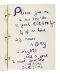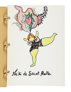 In-8° (mm 210x150). Carte [36] con testo e tavole a piena pagina a colori di Niki de Saint Phalle. Legatura in cartonato editoriale rilegata con tre anelli metallici, con il nome dell'Artista in verde al piatto anteriore. Ottima conservazione. (1) Libro d'artista pubblicato dalla Galleria Alexandre Iolas in occasione della mostra di Niki de Saint Phalle tenutasi nell'ottobre 1970 presso la sede milanese della galleria. Raro e significativo documento dell'esposizione, il volume raccoglie 22 disegni a colori che sviluppano e accompagnano un testo in lingua inglese, in cui l'artista riflette, con tono ironico e poetico, sui temi del tempo, dell'eternità e del rapporto con lo spettatore.