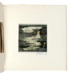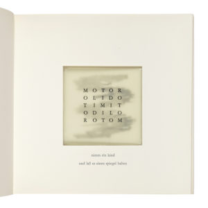 In-8° carrè (mm 198x198). Libro d'artista contenente un testo poetico sperimentale di Konrad Balder Schauffelen e, a partire dalla carta [6], tutte le successive presentano al centro una finestra fustellata attraverso la quale è visibile un multiplo dello specchio di Jiri Kolar, firmato e datato dall'Artista, con un frammento di un suo ritratto fotografico serigrafato. Edizione di 100 copie numerate. (1) Edizione sperimentale di rara eleganza concettuale, nella quale la struttura stessa del libro diviene dispositivo ottico e poetico. Le pagine, ritmate da un'apertura quadrangolare, introducono un gioco di inquadrature successive che culmina nell'inserimento di un piccolo specchio: elemento minimo ma determinante, capace di trasformare la fruizione in un'esperienza partecipata, dove l'immagine non è data una volta per tutte ma si rigenera nel riflesso del presente.