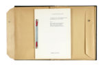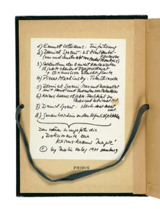 1 cartella editoriale a fisarmonica in-8° grande (mm 275x203) contenente 8 buste numerate in cui sono inseriti diversi documenti, tra cui il fac-simile del brevet de garantie rilasciato dall'Artista. Strappi riparati con nastro adesivo alla busta n. 2, altrimenti ottima copia. Cartella in similpelle con lacci e titoli in oro e rosso al piatto, con marginali segni di usura. Design di Daniel Spoerri. Una delle 100 copie numerate e firmate a matita da Spoerri al certificato di garanzia. Elenco dettagliato dei documenti disponibile su richiesta. (1)