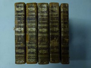 demi-basane brune, dos lisses ornés de motifs dorés, [Rel. de l'époque], frottées. Edition originale, ornée de 16 planches gravées sur acier, réunie en fin du dernier volume. Elles présentent divers appareils pour la préparation des vinaigres, l'obtention d'acides, des alambics, des chalumeaux, des appareils pour la préparation de l'éther, des piluliers, des siphons, des tubes, ou encore les appareils de Gannal ou de Cottereau, etc. Des rousseurs