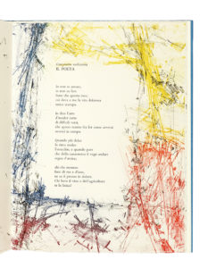 In-folio (mm 330x250). Carte [25]. Splendide litografie e incisioni in nero e a colori di Sandro Martini nel testo. Brossura completamente illustrata ai piatti, con titoli in nero a quello anteriore; sovraccoperta originale bluette, con titoli in nero al dorso, e custodia in cartone coordinato, con uno strappo al dorso. Una delle 100 copie ad personam, su una tiratura complessiva di 130, firmate dall'Artista al colophon. (1) Parole figurate 132-133.