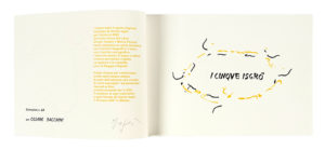 In-4° oblungo (mm 230x330). Carte [27] doppie con numerose incisioni calcografiche di Emilio Isgrò. Uno dei 100 esemplari ad personam, su una tiratura complessiva di 130 copie. Firma dell'Autore al frontespizio. UNITO A: Id., Cinque per venticinque. In-4° oblungo (mm 230x330). Carte [10]. Legatura alla cinese. Entrambi conservati dentro cofanetto di cartone giallo, illustrato in nero al piatto e al dorso, con minime tracce di usura. (2) Opera originale realizzata da Emilio Isgrò con, allegato, l'albo Cinque per venticinque in cui Isgrò narra la genesi dell'opera. Bellissimo libro d'artista realizzato da uno dei più grandi artisti italiani contemporanei, noto anche per la controversia con Roger Waters, nella quale Isgrò lo accusò di aver copiato le sue tipiche cancellature per la realizzazione della copertina del disco Is This The Life We Really Want? dei Pink Floyd. Parole figurate 154-157.