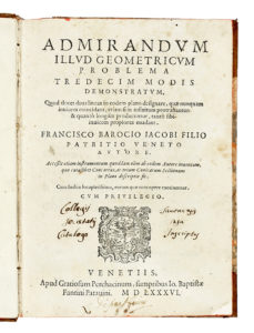 Barozzi Francesco, Admirandum illud geometricum problema tredecim modis demonstratum... Venetiis: Gratiosum Perchacinum, sumptibus Io. Baptistae Fantini Patauini, 1586.