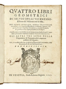 In-4° (mm 204x145). Pagine: [8], 132 [i.e. 134], [2]. Bella marca tipografica al frontespizio, pregevoli testatine, capilettera e finalini xilografici e moltissime incisioni in legno di corredo al testo. Nota manoscritta al frontespizio anticamente cassata, prime carte con lieve arrossatura al margine superiore, fascicolo E4 con pallida brunitura, forellino di tarlo da H4 fino a M4 con minime perdite di qualche lettera e inciso, qualche rara fioritura. Nel complesso buona copia genuina. Piena pergamena floscia coeva con titoli manoscritti al dorso. (1) Prima edizione collettiva che contiene due opere, pubblicate per la prima volta nel 1565 e nel 1573 e più volte ristampate, che propongono l'applicazione della geometria all'architettura (distanze, misure, proporzioni - anche della Terra -, profondità, ecc.). Adams B-521; BL/STC Italian p. 79; Honeyman 273; Riccardi I, 108: 'raro'; Cicognara 427: «Le opere di Silvio Belli sono pregiatissime per la scienza, e chiarezza delle esposizioni.».